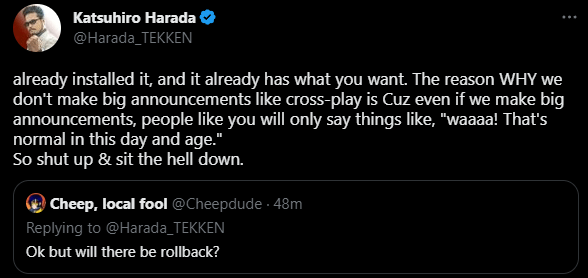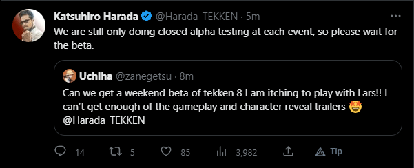 As you can see in these recent tweets, Harada confirmed that rollback netcode will be implemented in Tekken 8, along with crossplay functionality and a beta test.