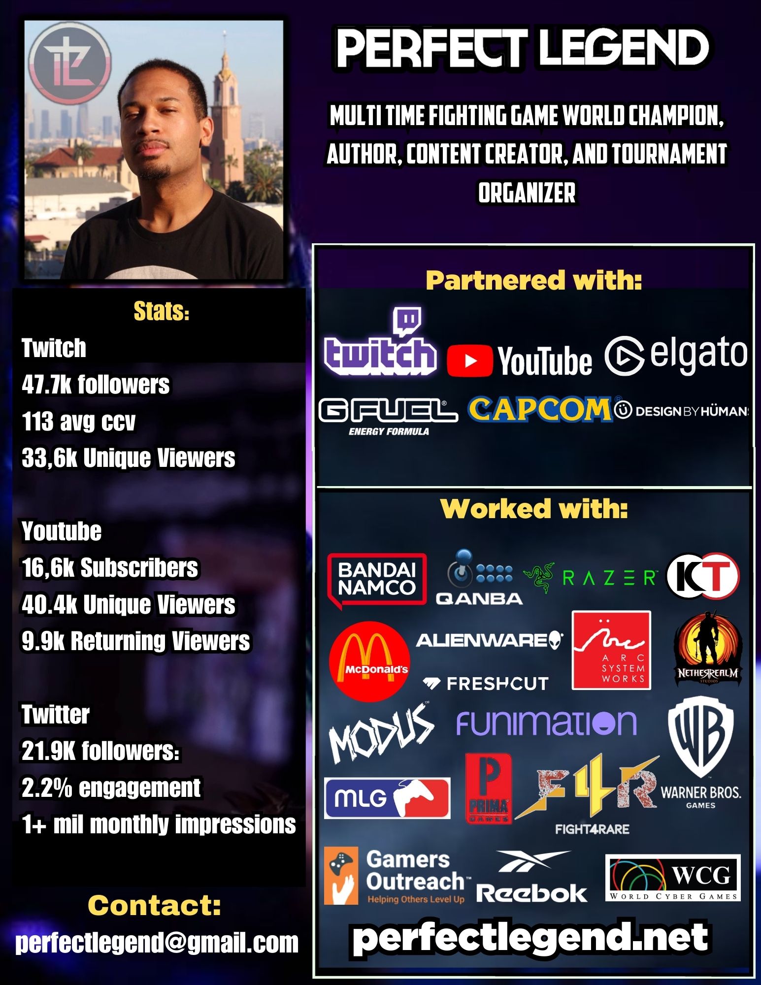 Perfect Legend has been featured on IGN, DirecTV, Spike TV, and G4TV, and remains a leading voice, competitor, and educator in modern fighting games.